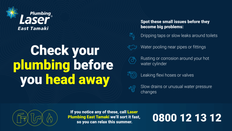 Call 0800 12 13 12. Book your pre-holiday plumbing today with Laser Plumbing East Tamaki. Let us give you that one less thing to worry about — so you can truly enjoy your break.